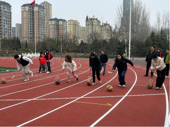 在毽球比赛中,女教师们以个人为单位,一分钟内奋力踢毽,展现灵活的脚上功夫;跳绳项目中,三人一组自由组队,大家在各自的一分钟时间内飞快跳跃,绳影摇曳,现场气氛热烈;踩气球环节,分工会小组两人一组,将气球绑在脚踝上,一边努力踩爆他人气球,一边巧妙保护自己的气球,欢声笑语回荡在操场;赶猪跑项目里,小组两人配合,用体操棍小心翼翼地拨动 “猪”(球),朝着 “猪栏”(终点)前进,途中还要时刻注意球不能滚出跑道,团队协作与专注力在此体现得淋漓尽致。