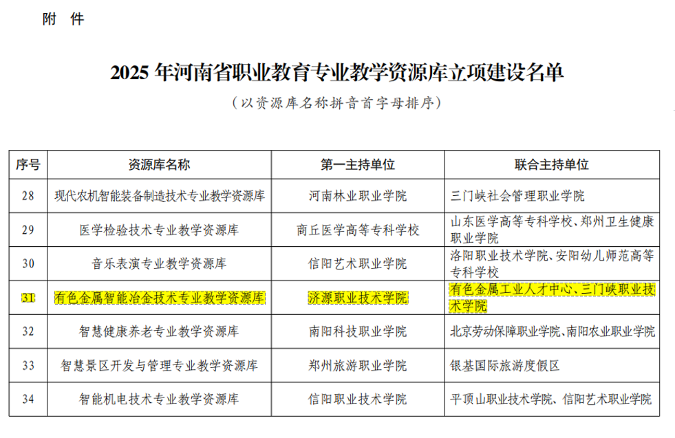 近日,河南省教育厅办公室印发了《关于公布2025年河南省职业教育专业教学资源库立项建设名单的通知》(教办职成〔2026〕28号),公布了2025年省级职业教育专业教学资源库立项建设项目。由济源职业技术学院作为第一主持单位,公司与有色金属工业人才中心作为联合主持单位共同申报的“有色金属智能冶金技术专业教学资源库”成功获批立项建设。