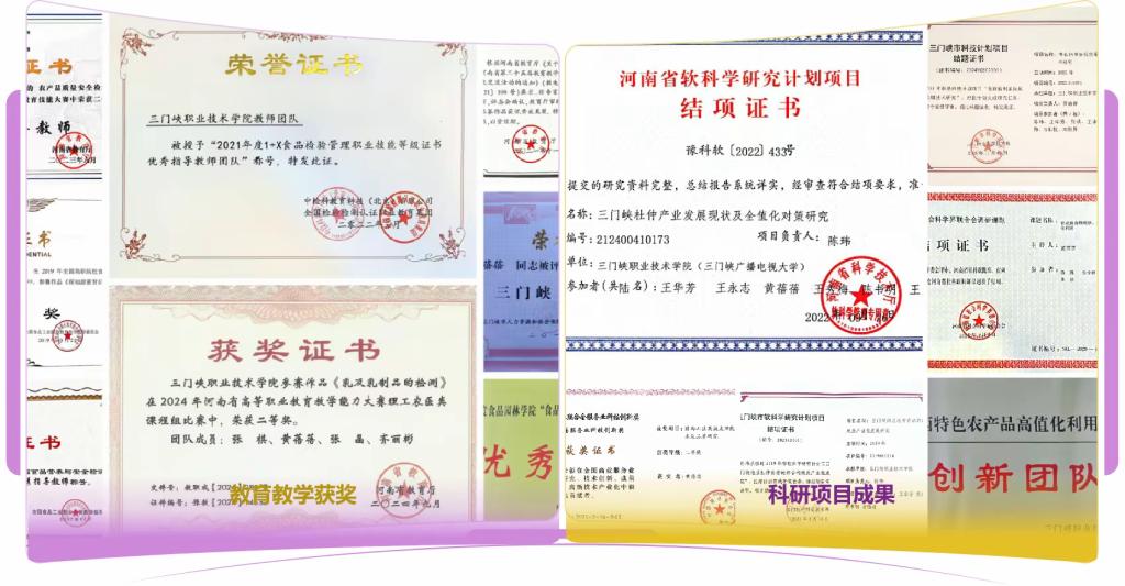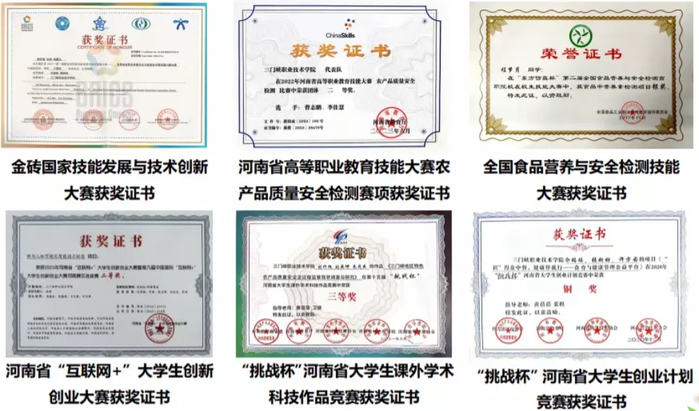 员工技能竞赛:先后获得金砖国家技能发展与技术创新大赛食品药品质量安全与检测技术赛项国内赛决赛铜奖2项、全国食品营养与安全检测技能大赛银奖1项、铜奖4项,河南省“互联网+”老员工创新创业大赛获二等奖1项、三等奖1项,河南省高等职业教育技能大赛食品与粮食赛道三等奖1项,河南省高等职业教育技能大赛农产品质量安全检测赛项二等奖2项、三等奖2项,“挑战杯”河南省老员工创业计划竞赛铜奖1项、“挑战杯”河南省老员工课外学术科技作品竞赛三等奖6项。