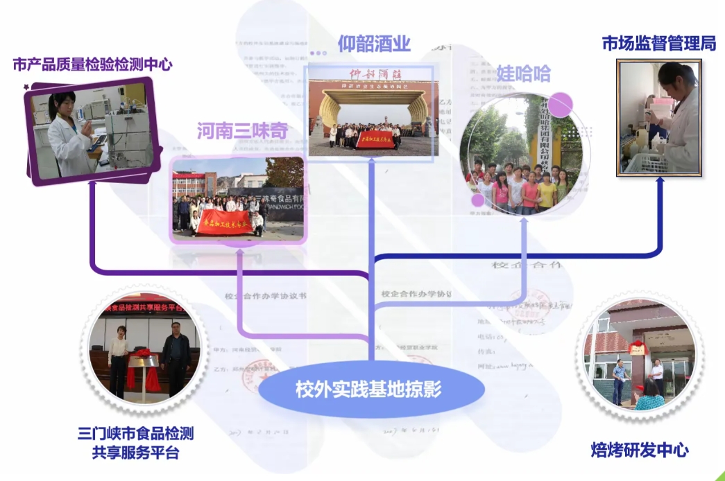 校外实践基地:与娃哈哈、喜之郎、徐福记、仰韶酒业、三味奇、市场监督管理局、海关、市产品质量检验检测中心等企事业单位,签订合作协议,建立校外实训基地,以及共建三门峡市食品检测共享服务平台、焙烤食品研发中心等技术服务平台。