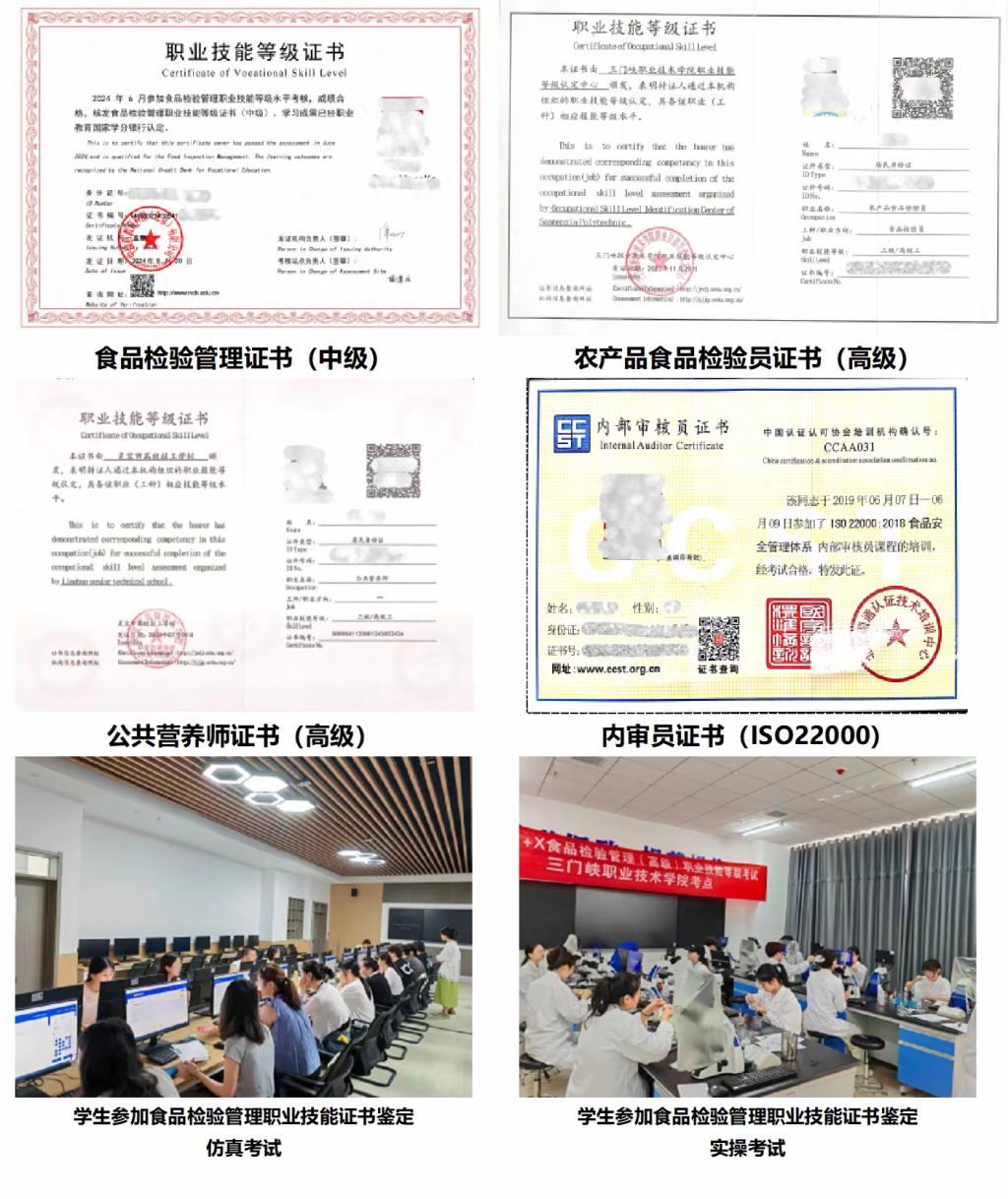 本专业可以考取食品检验管理(中级)、农产品食品检验员(高级)、产品品质控制管理人员(包含ISO内审员、HACCP内审员)、食品安全员(师)等证书,近三年证书考取通过率均为100%,且取得两个职业技能等级证书的员工比率达100%,为提升就业质量、拓展就业途径奠定了坚实的基础。