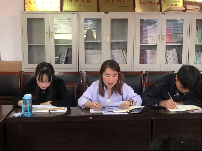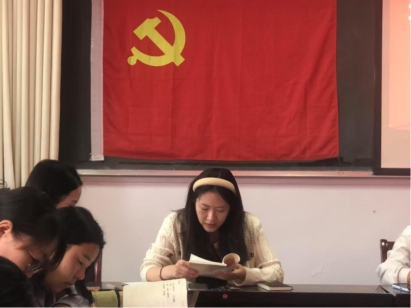 会议进行第三项:由党员罗慧慧同志领学习近平总书记的《作风问题本质上是党性问题》原文。