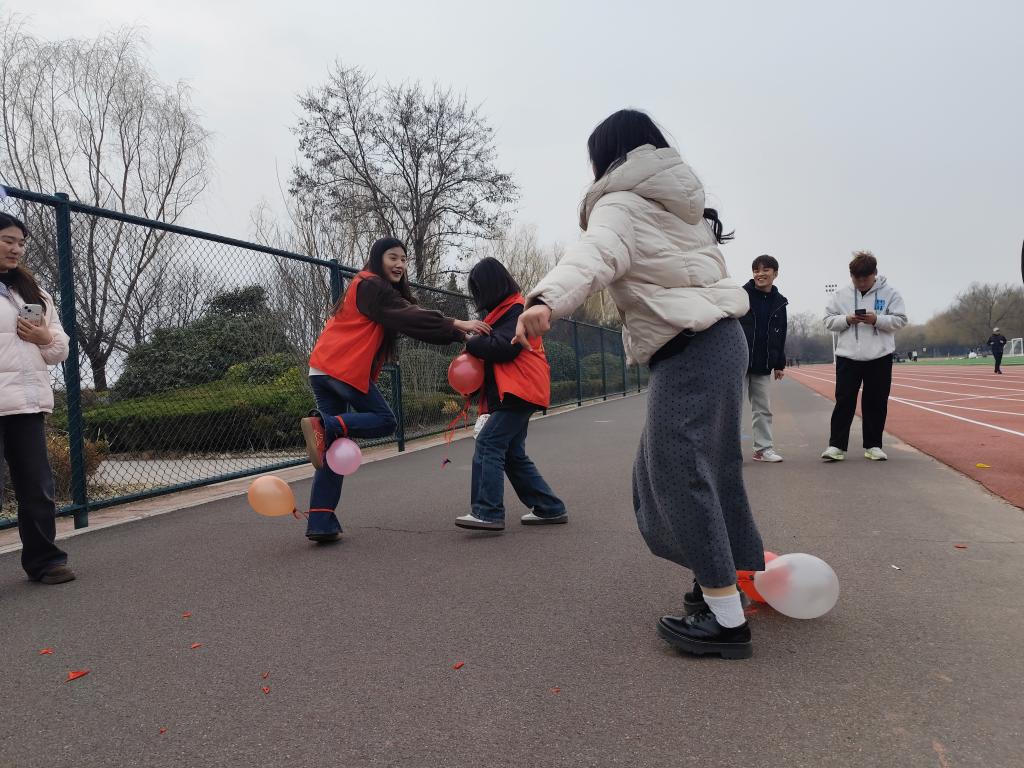 活动伊始,团总支书记发表动员讲话,号召青年学子“走出课堂、拥抱自然,在团队协作中锤炼品格”。随后,“赶猪跑”“踩气球”等集体游戏轮番上演,现场欢笑声此起彼伏。“赶猪跑”环节中,队员们手持长杆推动“充气小猪”冲刺,既考验速度又需默契配合;而“踩气球大战”则化身“体力与策略”的较量,大家你追我赶,将团队协作精神展现得淋漓尽致。活动还穿插了春日摄影打卡、环保志愿行动等环节,学子们用镜头记录春色,以行动守护绿水青山。