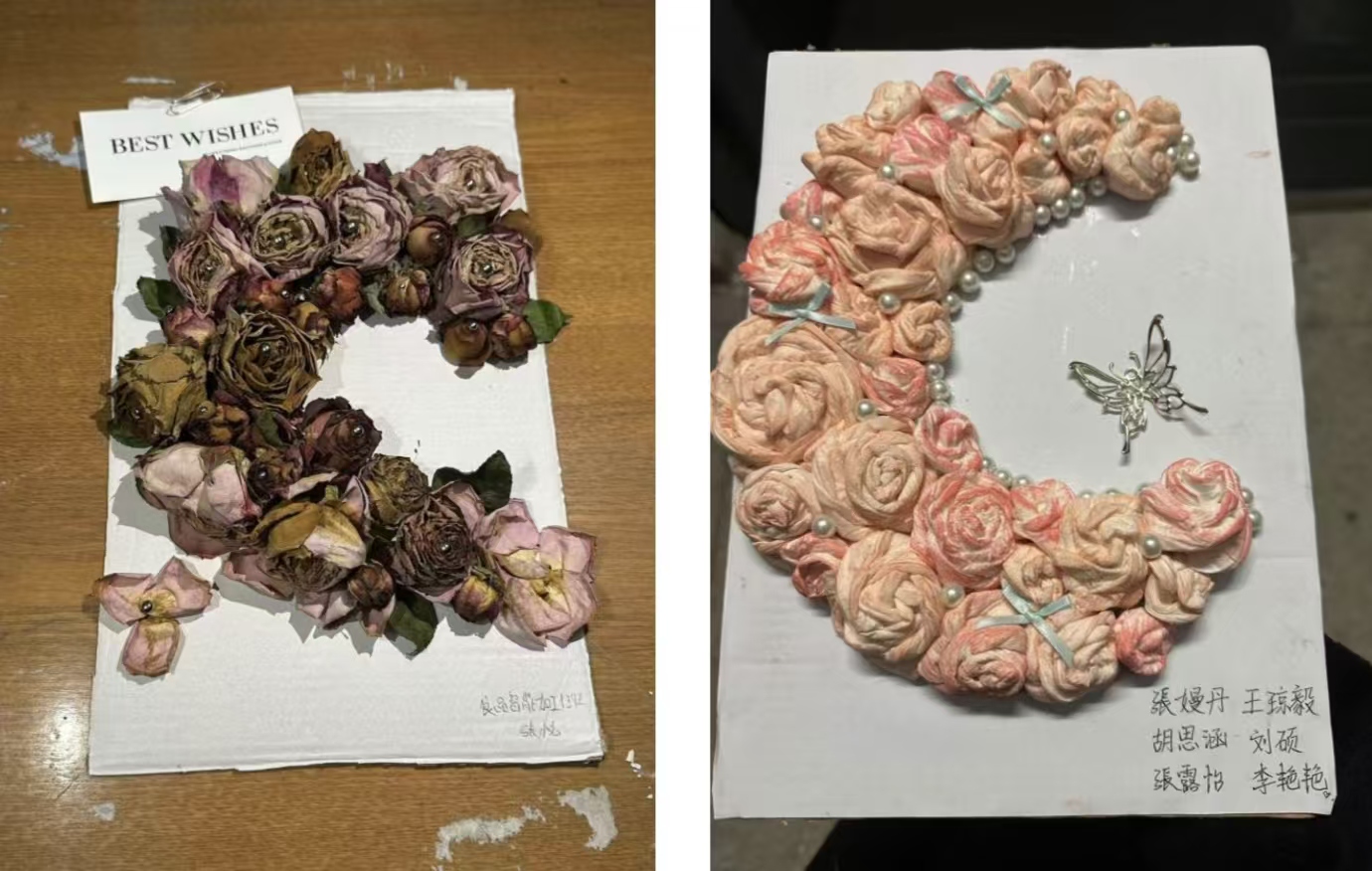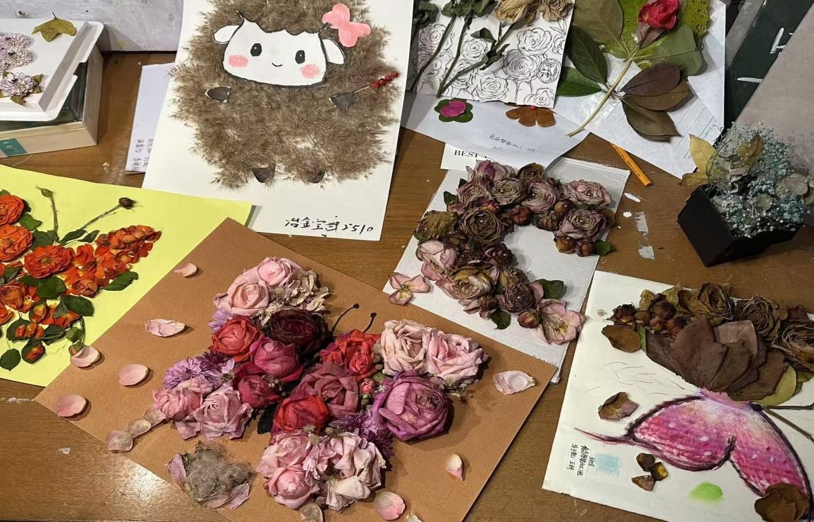 活动一经开展,大家反响热烈,大家在校园的角落里寻找干花素材,包括玫瑰、树叶、芦苇草等,以及各类制作工具,制作者们精心挑选最饱满、颜色最鲜艳的花朵作为原料,确保每一片花瓣、每一根枝条都最大程度地保留自然之美。他们相信,只有最贴近自然的选择,才能制作最能触动人心的作品。