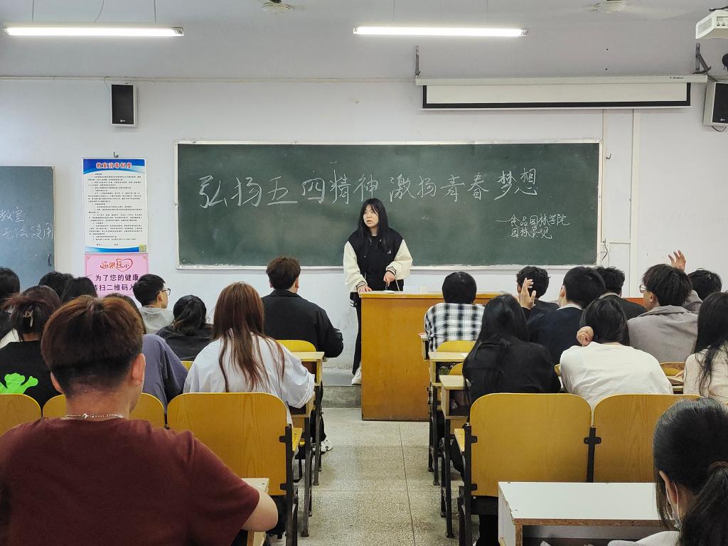首先,由彭佩瑶同学分享关于五四运动的爆发原因、过程以及意义等方面的事件,使同学们对五四精神有了更深的理解和体悟,她号召同学们在日常的学习生活中继续弘扬和传承五四精神。她倡导同学们要拒绝“躺平”和“摆烂”,充分利用大好时光和优越条件,积极进取,勤奋学习,全身心地投入到学业中,认识到自己的责任和使命。最后,她强调作为新时代青年,应当厚植五四爱国主义精神于民族复兴的伟大实践中,脚踏实地地走好新时代的长征路。