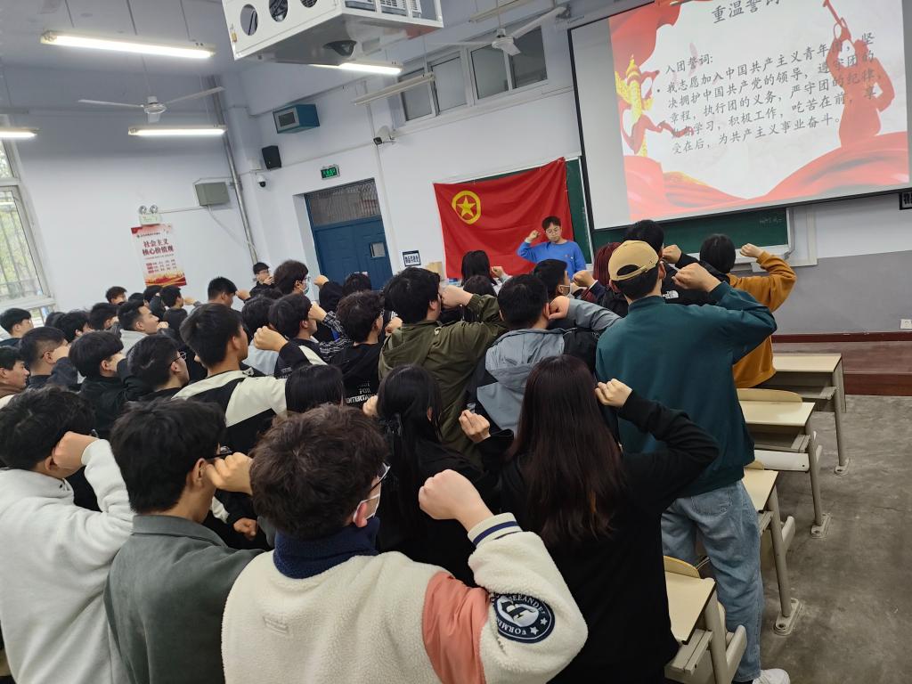 第三,全体团员重温入团誓词。他们面对鲜艳的团旗,大家举起右手庄严宣誓,经历了一次心灵的洗礼,进一步激励了新时代团员们始终坚定不移地跟随党的步伐,守初心担使命,奋发有为,贡献青春力量,以坚定的理想信念书写青春华章。